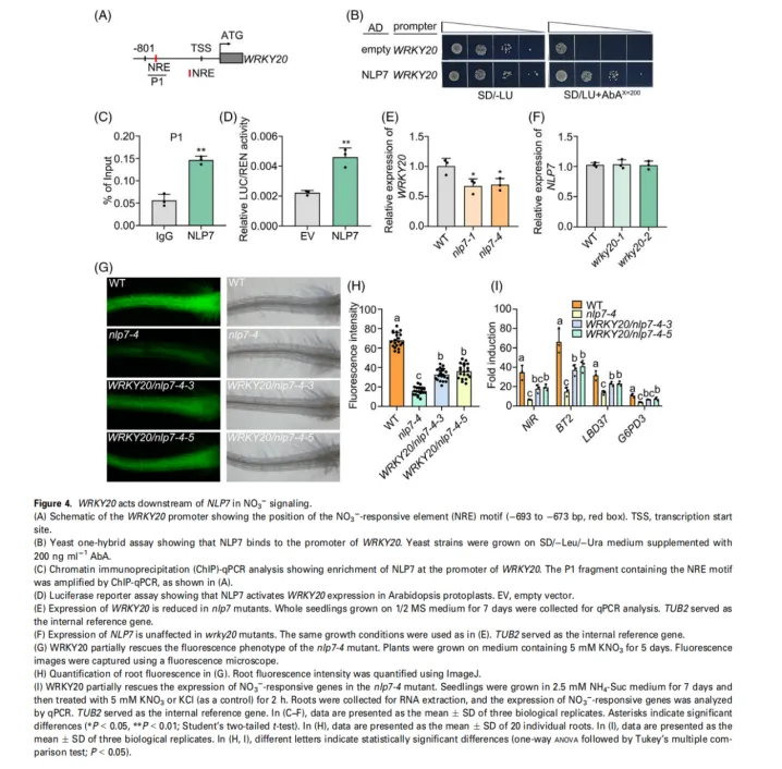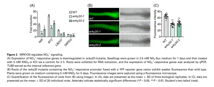 由于吸收和同化受损,wrky20突变体中的硝态氮含量显著降低。遗传学和分子证据表明,WRKY20在硝态氮信号传导通路中NLP7的下游发挥作用。