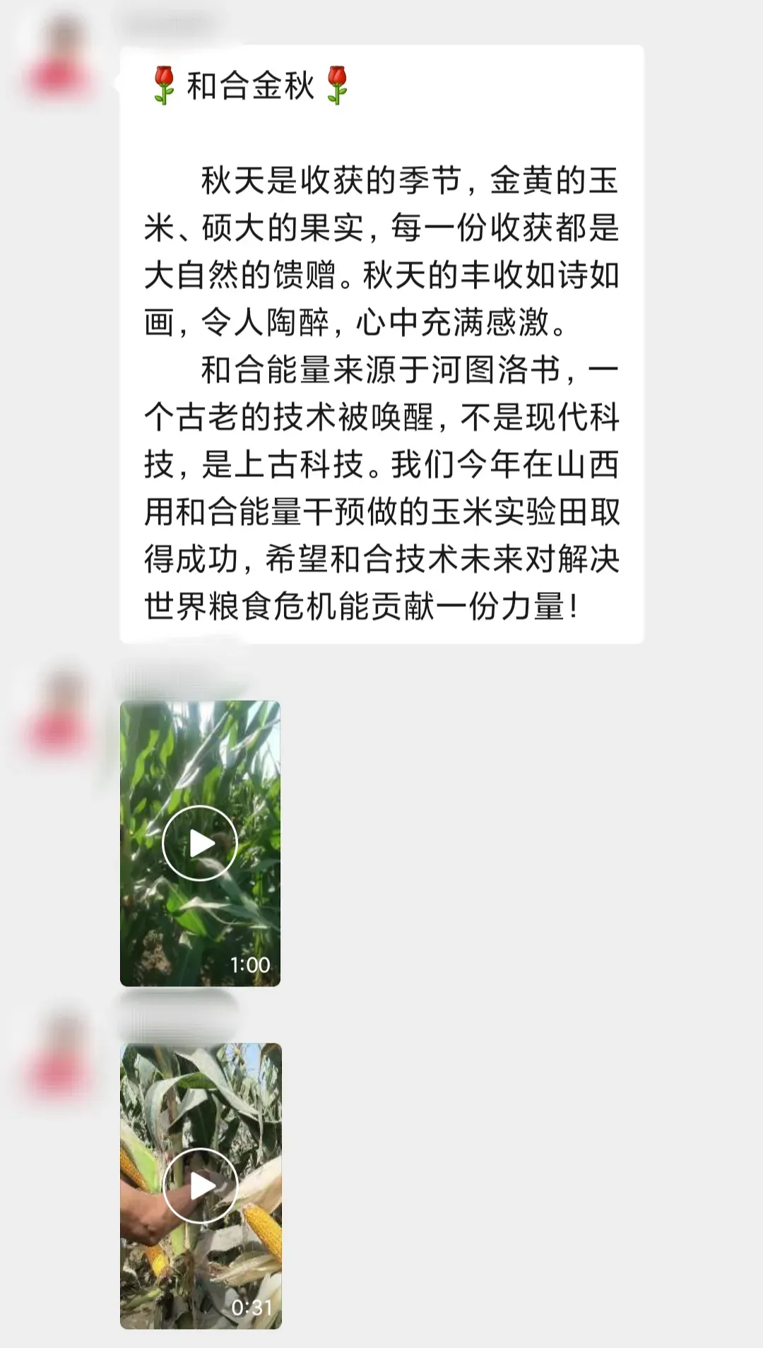 和合能量来源于河图洛书,一个古老的技术被唤醒,不是现代科技,是上古科技。我们今年在山西用和合能量干预做的玉米实验田取得成功,希望和合技术未来对解决世界粮食危机能贡献一份力量!