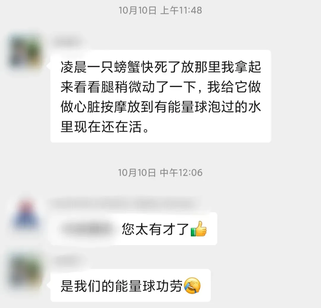 凌晨一只螃蟹快死了,放那里,我拿起来看看,腿稍微动了一下,我给它做做心脏按摩,放到有能量球泡过的水里,现在还在活。