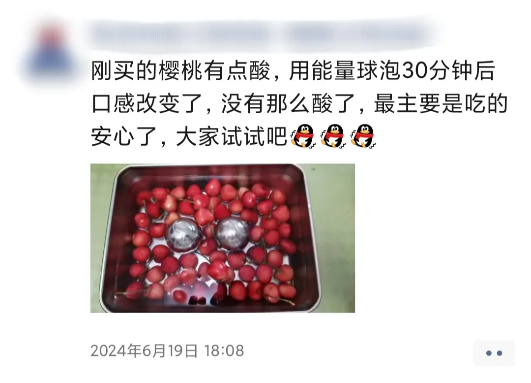 刚买的樱桃有点酸,用能量球泡30分钟后口感改变了,没有那么酸了,最主要是吃的安心了,大家试试吧。