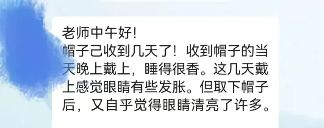 (和合能量)帽子已收到几天了!收到帽子的当天晚上戴上,睡得很香。这几天戴上,感觉眼睛有些发胀。但取下帽子后,又似乎觉得眼睛清亮了许多。