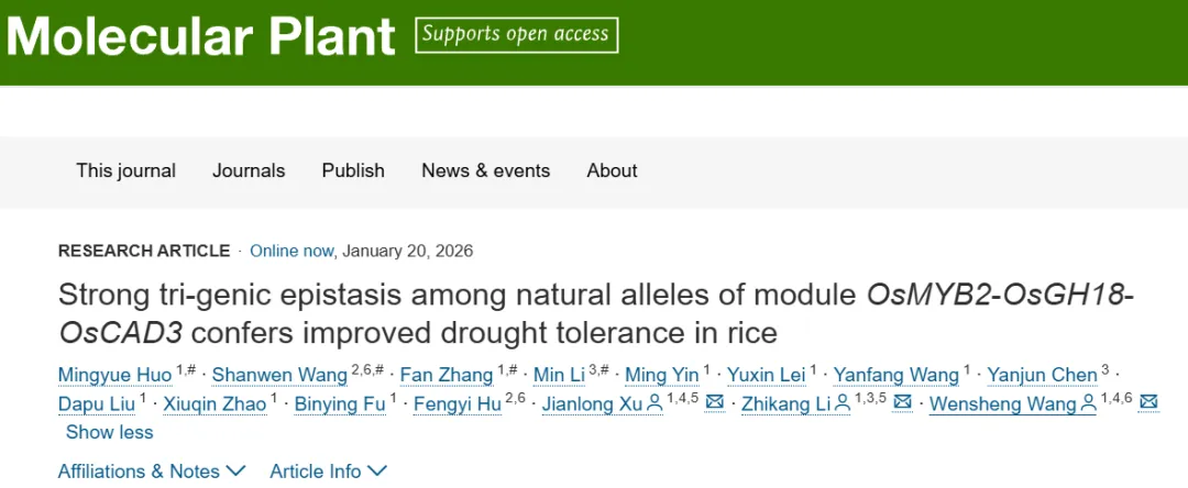 2026年1月20日,安徽农业大学教授黎珉以共同第一作者在《分子植物(Molecular Plant)》上发表题为“Strong tri-genic epistasis among natural alleles of module OsMYB2-OsGH18-OsCAD3 confers improved drought tolerance in rice”的研究论文,成功克隆并系统解析了水稻中三个互作耐旱基因OsMYB2、OsGH18与OsCAD3,揭示了它们通过调控木质素合成、强化细胞壁结构,协同调控水稻全生育期耐旱性的新机制。
