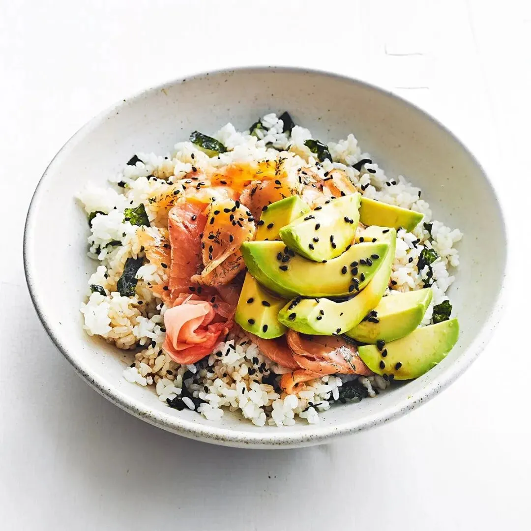 把米饭和切好的大叶放进碗里,和三文鱼一起搅拌均匀。切片牛油果,把三文鱼和米饭和牛油果一起摆盘。