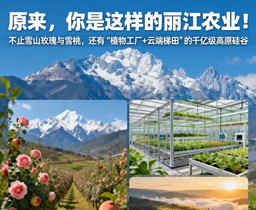 原来,你是这样的丽江农业!——不止雪山玫瑰与雪桃,还有“植物工厂+云端梯田”的千亿级高原硅谷——半个月前,我把调研计划发到朋友圈,点赞瞬间破百,却几乎没人追问:还有别的吗?直到我真正走进丽江:在海拔2800米的太安乡,看到LED“光配方”种出的零农残草莓,装进昆明长水机场头等舱甜品;在玉龙雪山南麓,见证5G云端梯田实时把墒情、虫情推送到上海手机;在泸沽湖畔,摩梭阿妹直播卖“区块链松茸”,一公斤拍出万元天价——我才狠狠意识到:原来,你是这样的丽江农业!一、颠覆认知:从“土特产”到“高原智能硅谷”