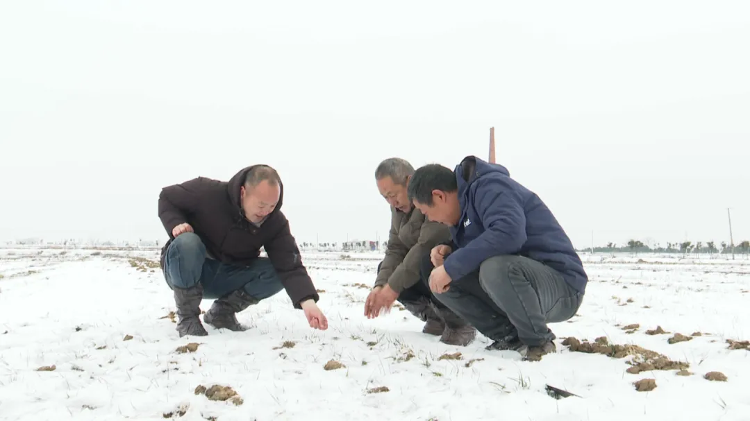 在枣阳市七方镇刘寨村的一处农田里,皑皑白雪覆盖着整齐的麦垄,农技专家与农户们一起拨开雪层,仔细查看小麦分蘖数量、次生根发育情况,攥取土壤查看墒情。同时,向农户讲解此次降雪有效补充了土壤水分,但对于部分晚播麦田和低洼地块,需防范积雪融化后出现的渍害,以及低温可能引发的冻害风险。