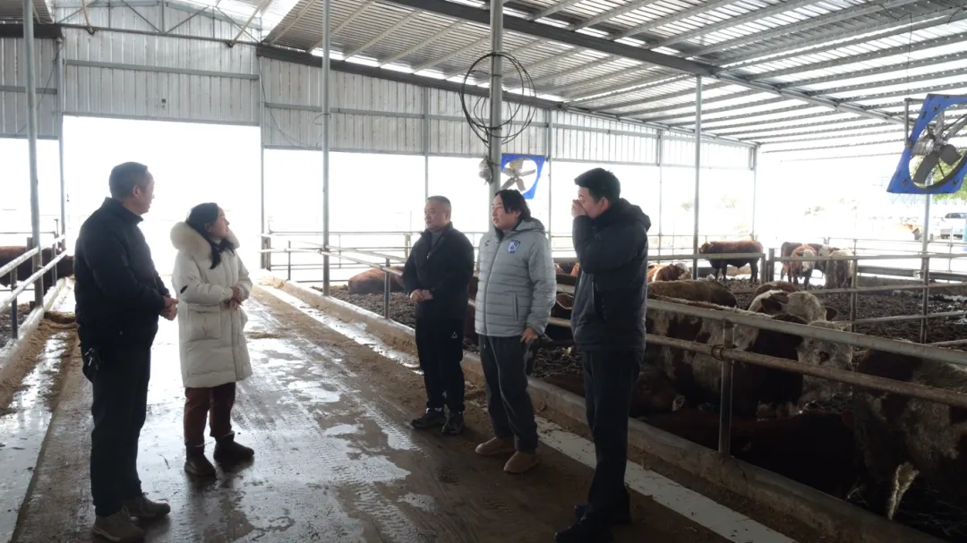 雪后初霁,在枣阳市鹿头镇宇硕牧业公司牛群养殖场内,枣阳市畜牧产业服务中心的技术人员正细致查看牛群状态、逐一排查设施隐患,现场开展针对性指导。