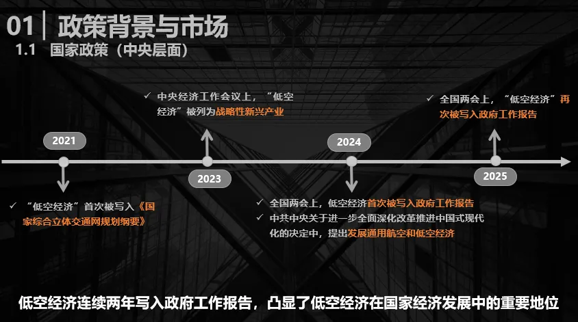 我国低空经济的发展获得了宏观政策的支持:2021年,低空经济首次被写入《国家综合立体交通网规划纲要》;2023年底中央经济工作会议将其确立为战略性新兴产业;2024年被称为“低空经济元年”,在全国两会上,低空经济首次被写入了政府工作报告,同年国家发改委成立低空经济发展司;在2025年的全国两会上,低空经济再次被写入了政府工作报告。这一系列政策举措,凸显了低空经济在国家发展中的重要地位。