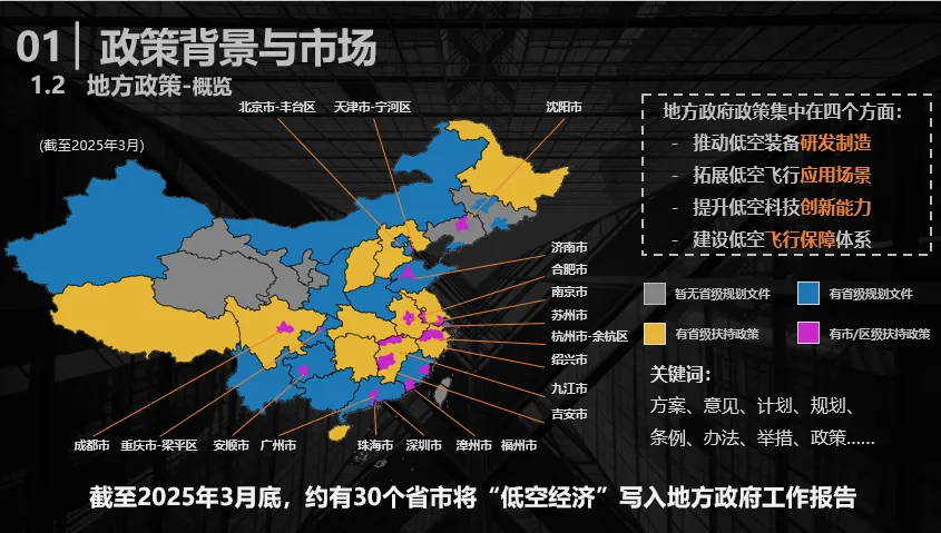根据前期梳理汇总,截至2025年3月底,全国已有约30个省市将低空经济写入了地方政府工作报告。其中,部分省份聚焦经济基础较好、具备落地条件的地市或区县先行先试,出台了落地性扶持政策。宁夏也在编制低空经济发展规划及实施指导意见。