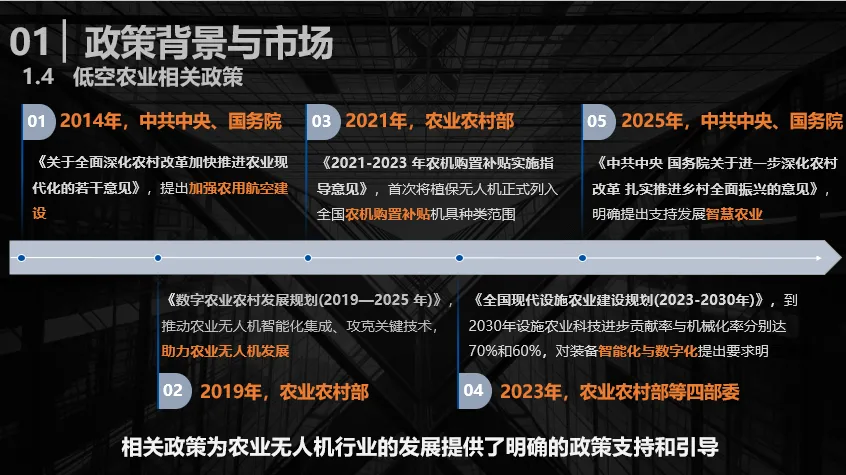 我国农业领域的低空发展得到了国家政策的持续赋能:2004年,农机购置补贴政策启动,每三年迭代更新一次,为农业装备推广奠定基础;2014年,中共中央、国务院在相关文件中提出“加强农用航空建设”;2017年,植保类无人机被纳入全国农机补贴试点;2019年,农业农村部明确提出“助力农业无人机发展”;2021年,农业农村部首次将植保类无人机正式列入全国农机购置补贴机具种类范围,2025年仍处于当期补贴政策覆盖之内;2023年,农业农村部联合其他三部委,对低空农业装备的智能化、数字化发展提出了明确要求;在2025年年初的全国两会上,中共中央、国务院再次明确提出支持发展智慧农业。这一系列政策层层递进、持续加码,为低空农业装备及无人机行业发展提供了清晰的政策导向与有力支撑。