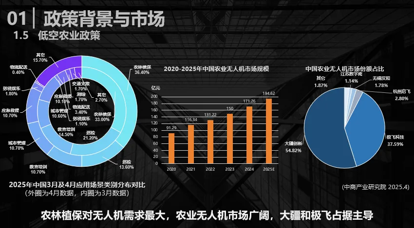 从2025年3-4月低空场景采购数据来看,植保类无人机的市场关注度持续攀升:3月占比达33%,已近三分之一;4月占比进一步提升至36.4%,凭借当前高占比与持续增长潜力,成为低空应用场景中的热点。市场规模方面,该领域从2020年的91.3亿元预计增长至2025年的195亿元,发展势头向好。制造商竞争格局上,当前已形成大疆与极飞占据主导的格局,两家市场占比超过90%。因此后续关于低空农业装备的分享欲探讨,将主要围绕这两家企业的产品展开。