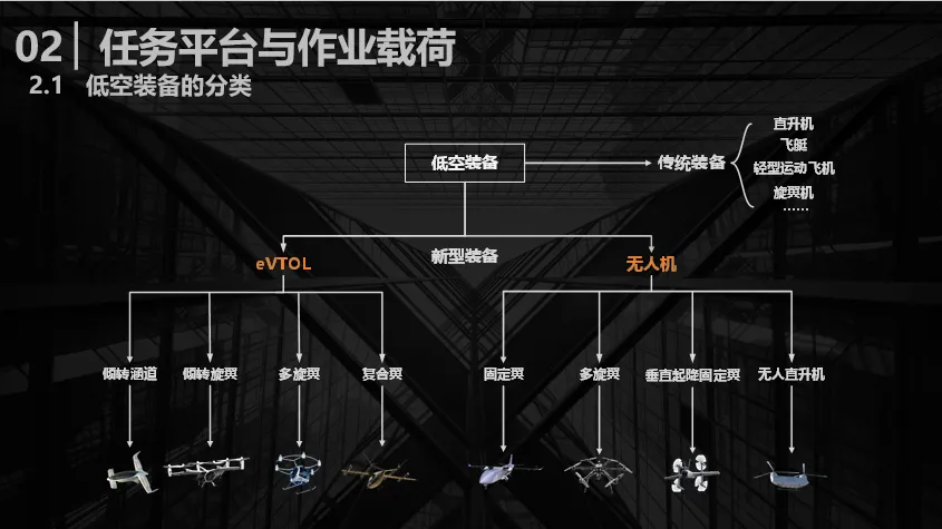 谈到低空装备,首先要对航空器进行分类,传统范畴内的航空器主要包括直升机、飞艇、轻型运动飞机等。而关于新型装备的界定,工信部印发的《绿色航空发展纲要》中给出了明确标准,即需满足“两高三化”要求。“两高”指高安全性、高可靠性,“三化”则是绿色化、智能化、高端化。eVTOL无人机符合这一“两高三化”要求。