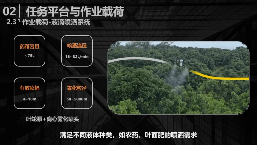 第一类是液体喷洒系统,该系统主要搭载不同型式的叶轮泵和离心雾化喷头,对药箱容量、喷洒流量、有效播幅和雾化粒径等指标均制定了详细的要求。
