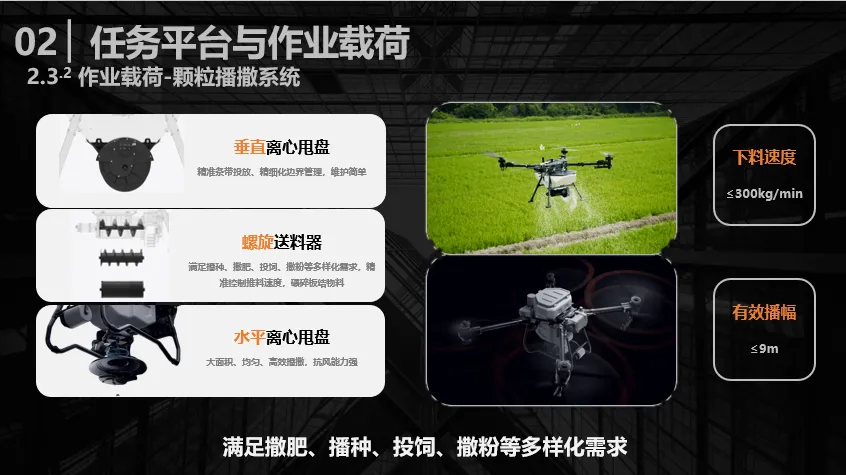 第二类是颗粒播撒系统,大疆与极飞两家主流厂商均采用了末端式离心甩盘的作业机构,二者的核心区别在于甩盘布置方式——一种采用垂直布置,利于实现精准的边界管理;另一种采用水平布置,着重提升看风能力与播撒效率。两种设计各有侧重,可充分满足农业生产中的多样化播撒需求,该系统的主要参数为下料速度和有效播幅。