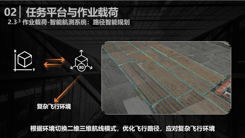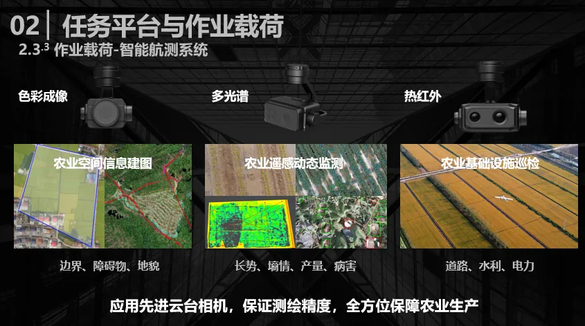 第三类是智能航测系统,主要应用到色彩成像、多光谱、热红外三种相机装备。通过单一相机或多种相机组合搭配,可实现多元化测绘任务,具体分为三类:一是农业空间信息建图,能够完成二维、三维空间信息构建;二是农业遥感与动态监测,主要用于作物长势、墒情监测,以及产量预测、病害管理;三是农业基础设施巡检,与工业巡检场景逻辑相近,重点对道路、水利、电力等配套设施开展巡检作业。无论无人机搭载何种作业载荷,都需要有一双“眼睛”进行航路规划。
