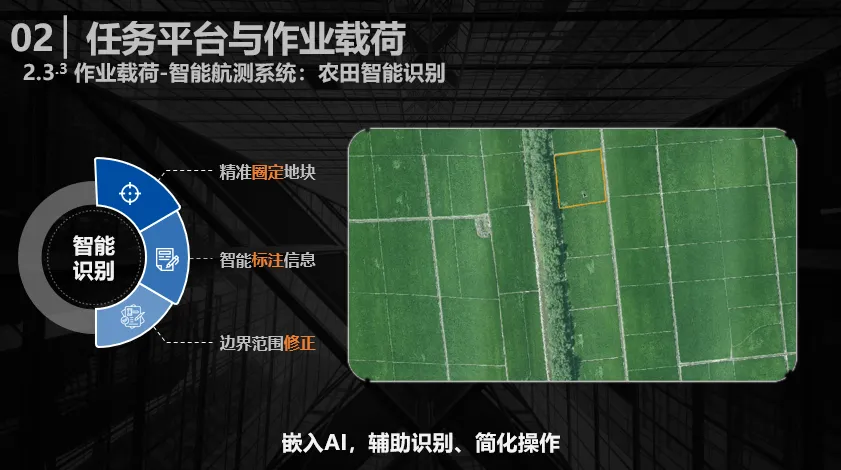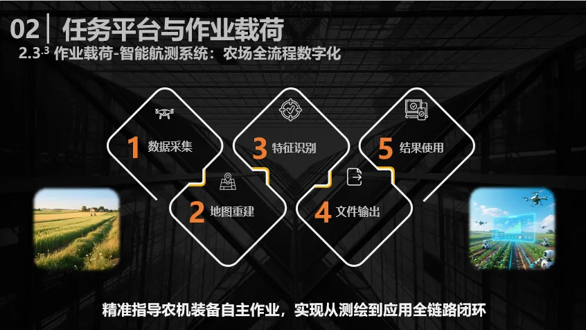 完成以上工作后,即可实现从前期数据采集、地图重建到识别农田特征等全流程处理,最终输出数字化农场文件。该应用场景不仅限于无人机使用,还包括地面农机设备,形成地面与天空的连动式作业,最终实现从测绘到应用的全链路闭环。