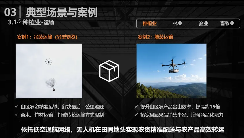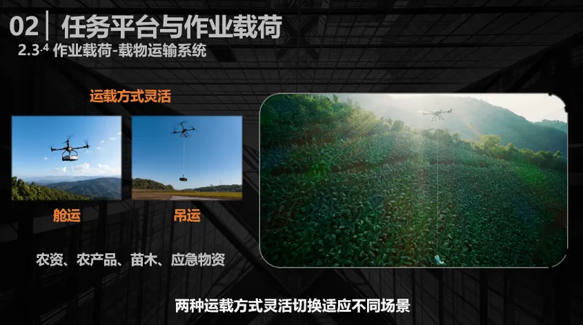 运输场景的应用主要分为吊运与舱运两种模式。其中,吊运模式主要是运输异形物资,例如山区农资的精准运输能够解决“最后一公里”的难题,苗木、竹材等特殊品类的运输,也能打破传统运输方式等限制。舱运不仅能将农产品出山效率提升约15倍,还能大幅拓宽果品的销售半径,增强农产品的商品化流通能力。