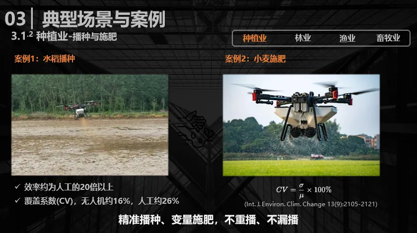 以播撒与施肥载荷场景为例,水稻播种、小麦施肥均是典型应用方向。相关论文数据显示,无人机作业效率可达人工的20倍以上;而在体现播撒均匀性的覆盖系数指标上——该指标播撒后农田内多点采样的标准差与均值之比:无人机的覆盖系数约为16%,人工约为26%。