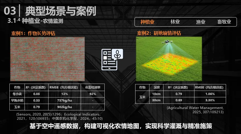 再来看航测系统的实际应用,左侧图片呈现的是作物早期出苗检测,这一数据结果可为后期的补种、施肥都有一定指导意义;表格则汇总了相关科研论文中的数据,针对不同作物的产量预测与虫害检测率展开分析,显示现有技术下的决定系数与误差均处于较高水平。右侧的案例是耕地墒情评估,也就是土壤含水量,有论文以玉米为研究对象,对不同土壤深度的墒情进行预测,其决定系数与误差同样达到较高水准。综合上述航测技术的应用成果,能够为农业生产实现精准灌溉、科学施策提供有力支撑。