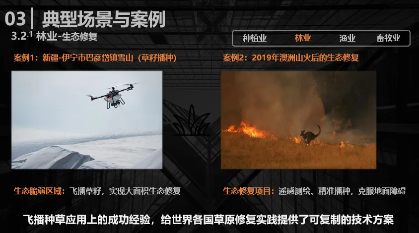 在林业领域,无人机应用最为广泛的场景是草籽飞播、生态修复。我国新疆地区的生态治理项目,以及2019年澳大利亚山火后的生态修复,均采用了这一技术方案。这些国内外的成功实践,也为晋侯草原生态修复提供了可复制、可推广的技术路径。
