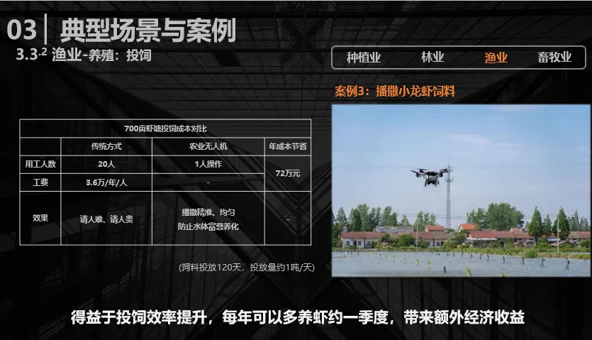 在渔业养殖场景中,无人机应用最广泛的是投递饲料。以700亩虾塘为例进行成本对比,每年可节约纯用工成本约72万元。无人机播撒效率高,可以精准控制用量,也能避免饲料过量投放后未被虾类食用、溶解于水体,进而造成富营养化问题。得益于投入产出效率的提升,养殖户每年的养虾周期也可相应延长,带来额外的经济收益。