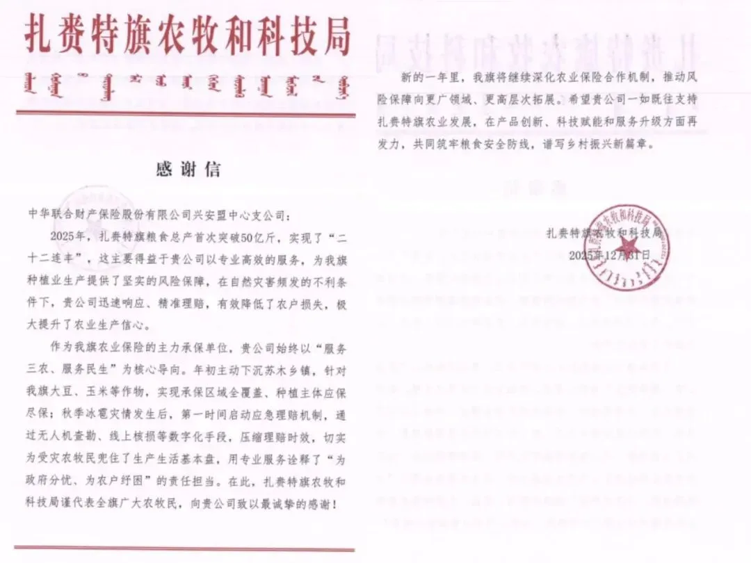 近日,中华财险兴安盟中支收到扎赉特旗农牧和科技局的感谢信,对公司在2025年度当地农业保险工作中的贡献表示高度评价和感谢。