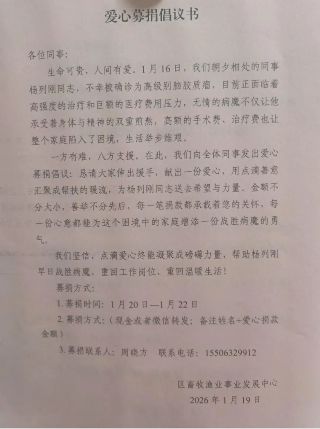 杨列刚是吴林街道办事处一名普通的动物防疫员。就在一周前,1月16日,一纸“高级别脑胶质瘤”的诊断书,突然为他和他的家庭蒙上了沉重的阴影。病魔来势汹汹,不仅让他承受着身心的巨大考验,随之而来的高额治疗费用,也让这个家庭步履维艰。