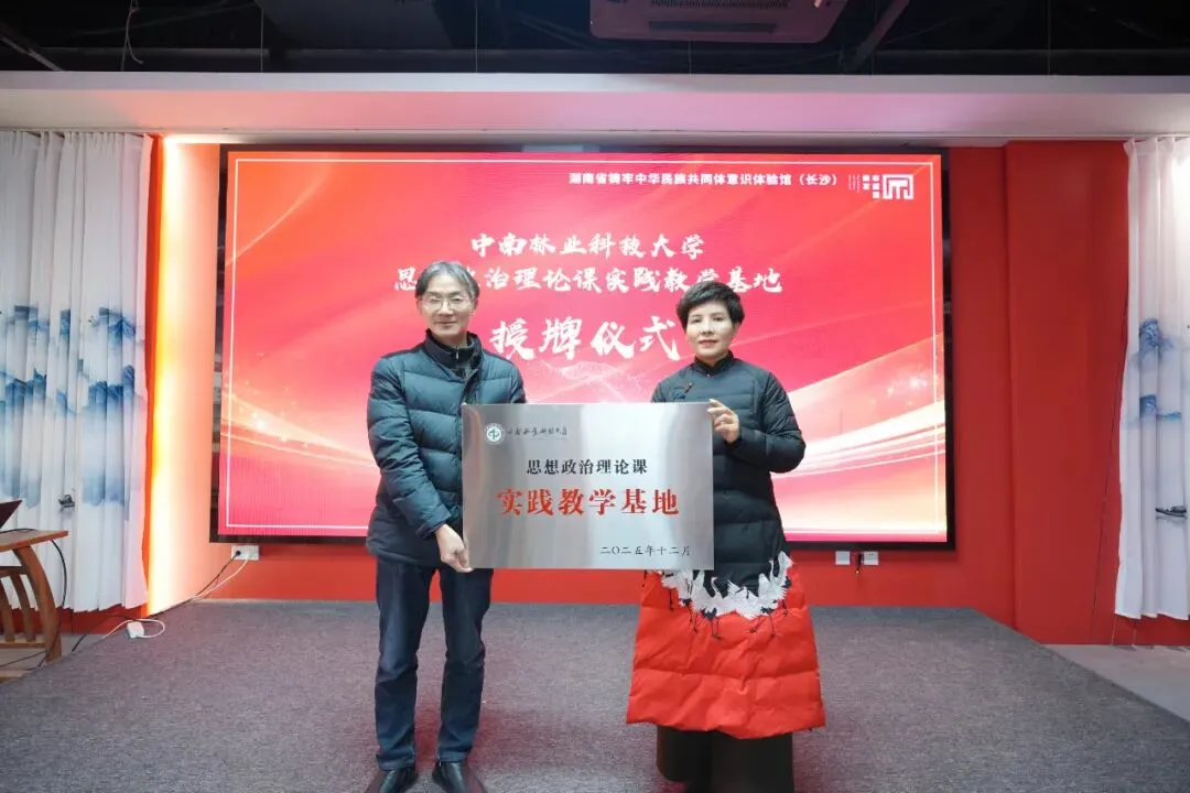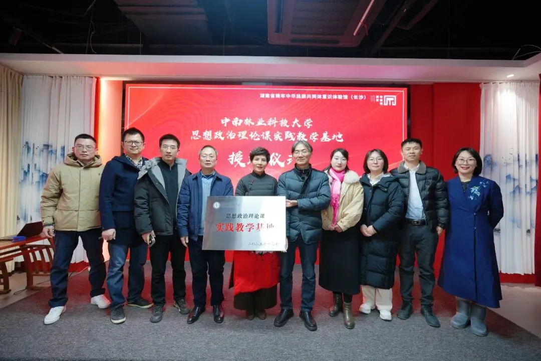 2026年1月23日,中南林业科技大学马克思主义学院与湖南省铸牢中华民族共同体意识体验馆(湖南雨花非遗馆)举行“思想政治理论课实践教学基地”签约授牌仪式。中南林马院党委书记邓集文、院长卿定文,湖南雨花非遗馆馆长邓运姣、教育中心总监王瑾出席。