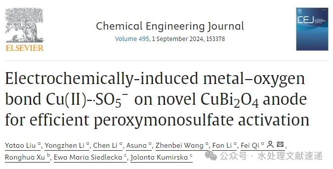 Yatao Liu, Yongzhen Li, Chen Li, Asuna, Zhenbei Wang, Fan Li, Fei Qi, Ronghua Xu, Ewa Maria Siedlecka, Jolanta Kumirska, Electrochemically-induced metal–oxygen bond Cu(II)-SO5− on novel CuBi2O4 anode for efficient peroxymonosulfate activation, Chemical Engineering Journal, 2024, https://doi.org/10.1016/j.cej.2024.153378
