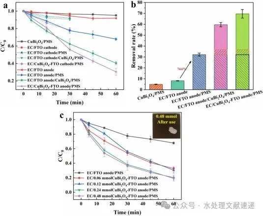 Fig. 3. PMT removal efficiency: (a) and (b) comparison of CuBi2O4 electrode activated PMS with CuBi2O4 catalyst activated PMS and pure FTO electrode electro-activated PMS; (c) the ability of CuBi2O4 electrode to activate PMS with different catalyst loads. (Reaction condition: [PMT]0 = 0.045 mmol/L, [PMS]0 = 0.65 mmol/L, [Na2SO4] = 50 mmol/L, j = 5 mA/cm2, GBE = 2 cm).