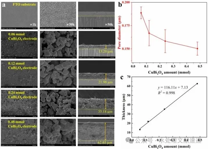 Fig. 4. (a) Surface and cross-sectional SEM images of CuBi2O4 electrodes with different loads of catalyst; Effect of load on (b) pore diameter and (c) thickness of CuBi2O4 electrode.