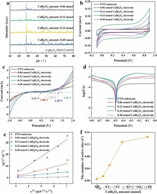 Fig. 5. (a) XRD patterns of CuBi2O4 electrodes with different loads; (b) CV curves, (c) LSV curves, and (d) Tafel curves of CuBi2O4 anodes with different loads; (e) and (f) Fitting results of theoretical number of active sites on CuBi2O4 anode surface with different loads.