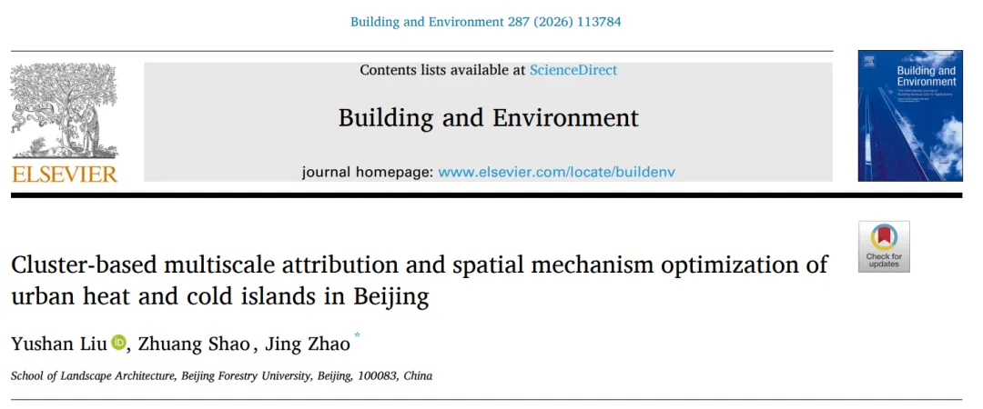 论文题目:Cluster-based multiscale attribution and spatial mechanism optimization of urban heat and cold islands in Beijing论文作者:Yushan Liu , Zhuang Shao , Jing Zhao期刊:Building and Environment第一单位:北京林业大学风景园林学院,北京 100083,中国DOI:https://doi.org/10.1016/j.buildenv.2025.113784