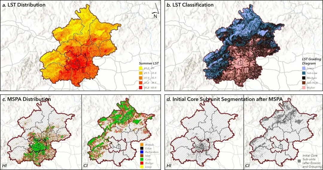 在快速城市化与全球气候变暖双重驱动下,城市热环境问题已从传统的“热岛识别”逐步转向“机制解析—空间调控—系统优化”的综合研究阶段。既有研究大量揭示了土地利用、建筑密度、植被覆盖等因素与地表温度(LST)的统计关系,但在空间异质性、尺度耦合以及冷热岛系统协同调控方面仍存在明显不足。尤其是在超大城市中,热岛(HI)与冷岛(CI)并非孤立存在,而是构成一个具有结构性、连通性与方向性的空间网络系统,这一系统性特征在以往研究中往往被简化或忽略。