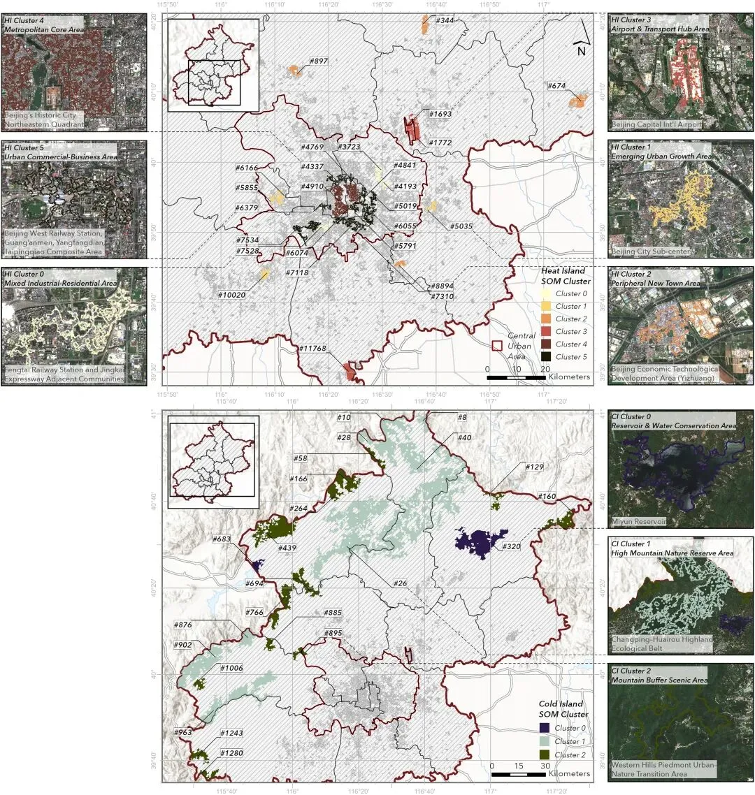 基于SOM聚类,热岛被划分为多种典型类型,如都市核心区、商业商务密集区、新城拓展区、交通枢纽区等;冷岛则主要表现为水库保育区、高山自然保护区与山前缓冲景观区。不同类型在建筑密度、功能结构、景观破碎度与生态配置上呈现出显著差异。