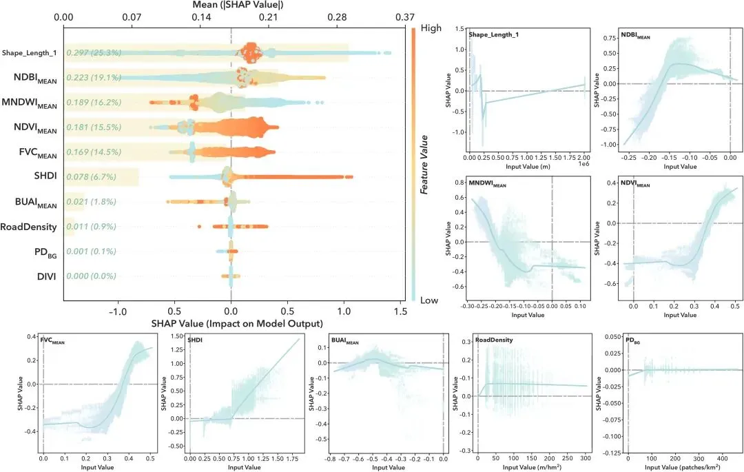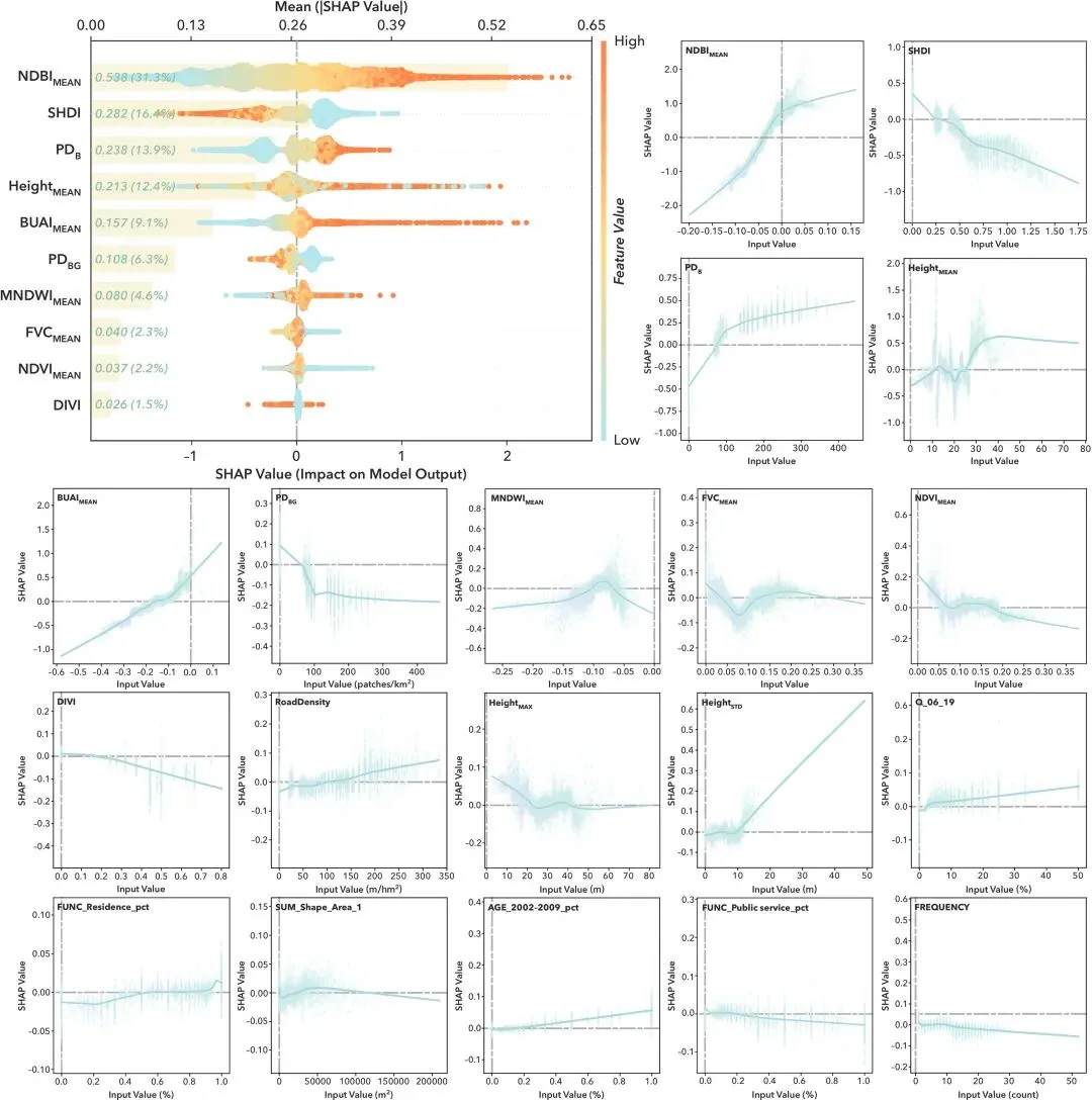 在全局尺度上,SHAP分析显示,建筑强度类指标(如不透水面比例、建筑密度与高度)是热岛升温的首要驱动因素,而景观多样性和植被覆盖则提供稳定的降温效应。值得注意的是,水体指标在高密度建成区中的降温贡献有限,提示“蓝绿空间”在不同情境下存在显著效应差异。