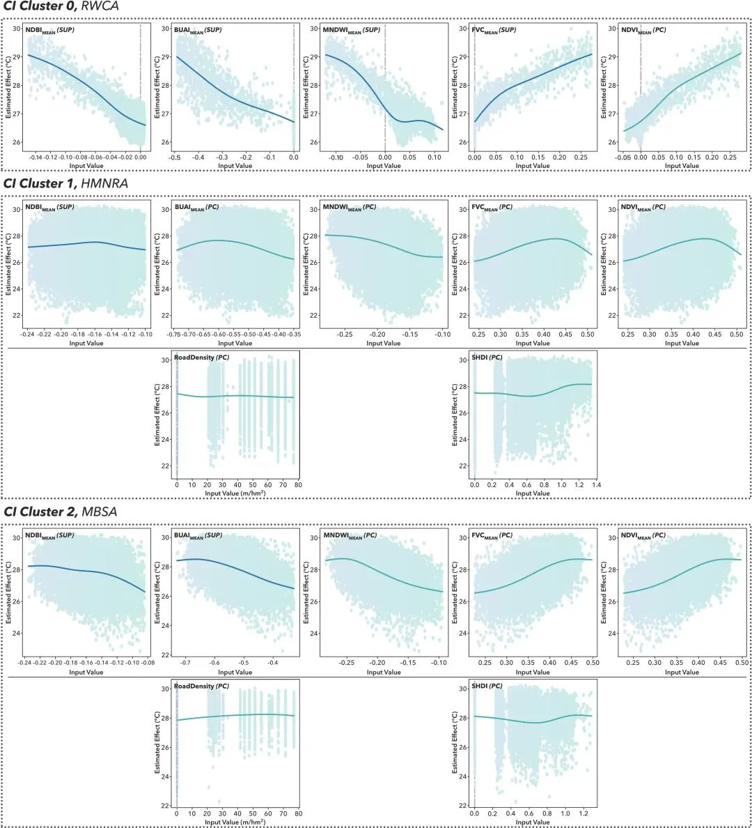 进一步的GAM分析揭示了类型内部的非线性机制。例如,在部分热岛类型中,植被指数在低—中值区间即可产生显著降温,而在冷岛类型中,只有当植被或水体达到较高连通度与规模时,降温效应才会显现甚至增强。这表明,冷岛的形成更依赖空间结构与尺度效应,而热岛缓解更依赖植被的韧性调节能力。