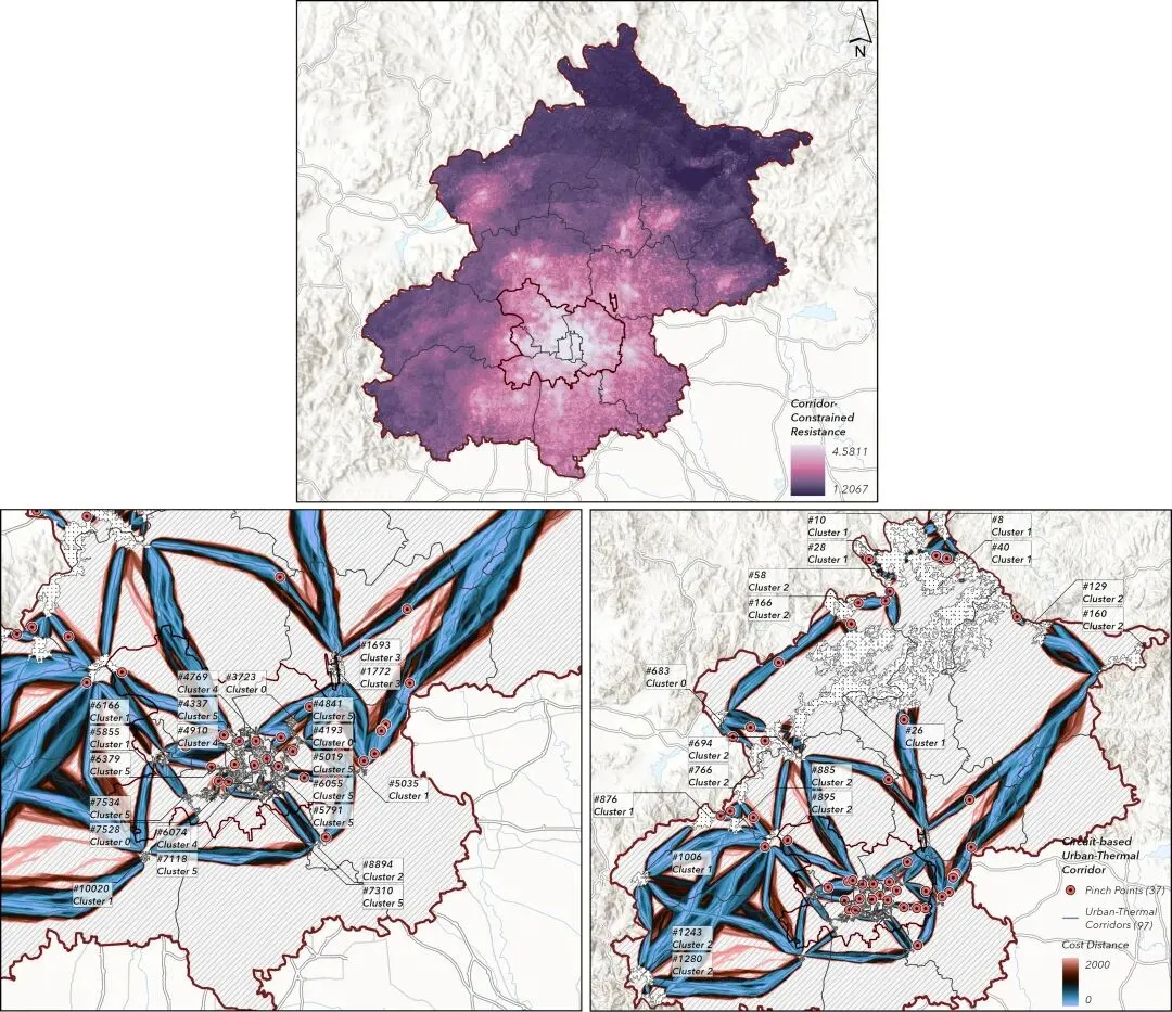 🖼️ 图 9. 走廊约束阻力面以及 HI/CI 集群的关键城市热走廊和瓶颈点的空间分布。