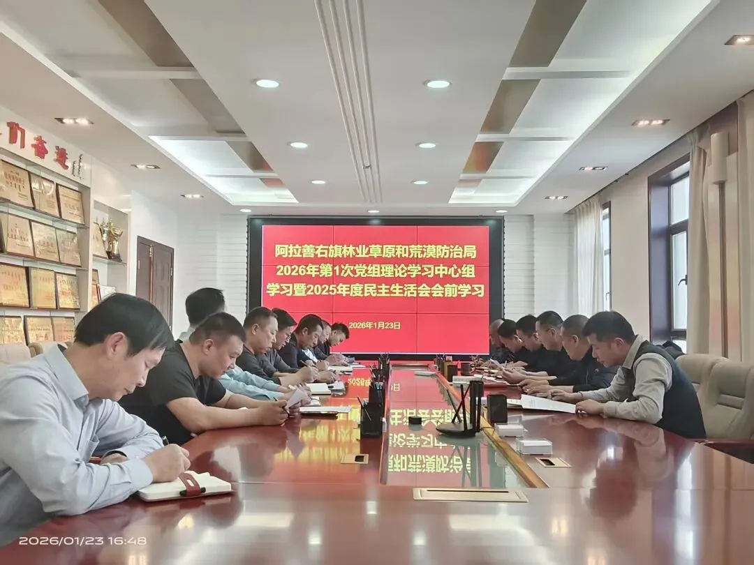 1月23日,阿拉善右旗林业草原和荒漠防治局召开2026年第1次党组理论学习中心组学习会议暨2025年度民主生活会会前学习,局领导班子、各股室二级单位负责人参加会议。