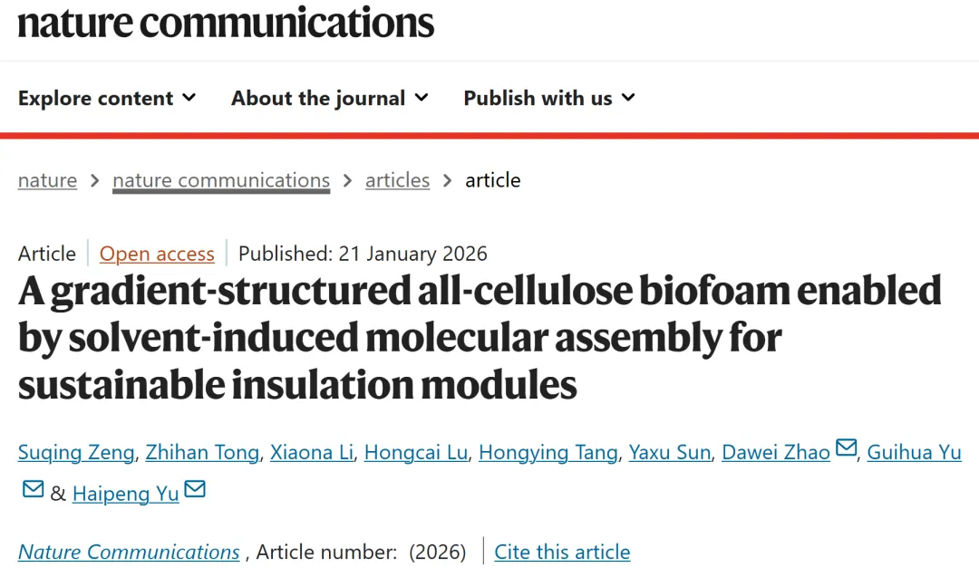 东北林业大学于海鹏教授 Nature Communications | 通过溶剂诱导分子组装策略制备梯度结构全纤维素生物泡沫