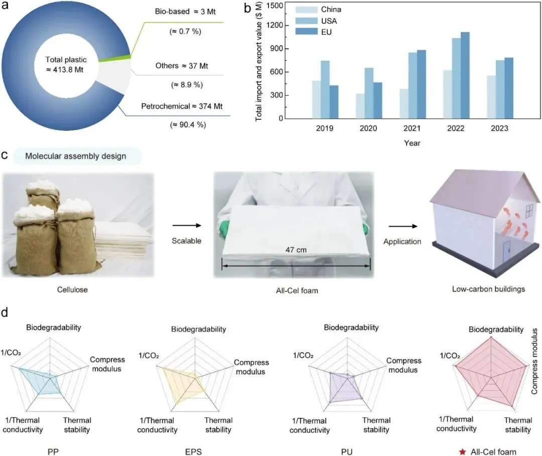 图1 | 全纤维素泡沫的概述及优点。a 2023年按聚合物类型划分的全球塑料产量统计。b 美国、欧盟和中国EPS的总进口和出口统计数据。c 通过溶剂诱导纤维素分子组装来制造全纤维素泡沫的工艺。d 比较全纤维素泡沫与传统塑料泡沫关键特性的雷达图。