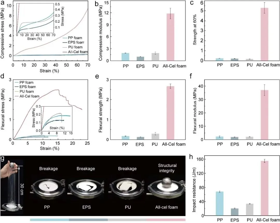 图3 | 全纤维素泡沫具有卓越的机械性能。a-c 以应力-应变曲线(a)、压缩模量(b)以及 60%应变下的压缩强度(c)的形式展示了全纤维素泡沫与商业塑料泡沫的压缩性能对比。d-f 通过弯曲应力-应变曲线(d)、弯曲强度(e)和弯曲模量(f)展示了全纤维素泡沫与商业塑料泡沫的弯曲性能对比。g 展示了全纤维素泡沫机械坚固性的数字照片。h 比较了全纤维素泡沫与商业塑料泡沫的抗冲击性能。