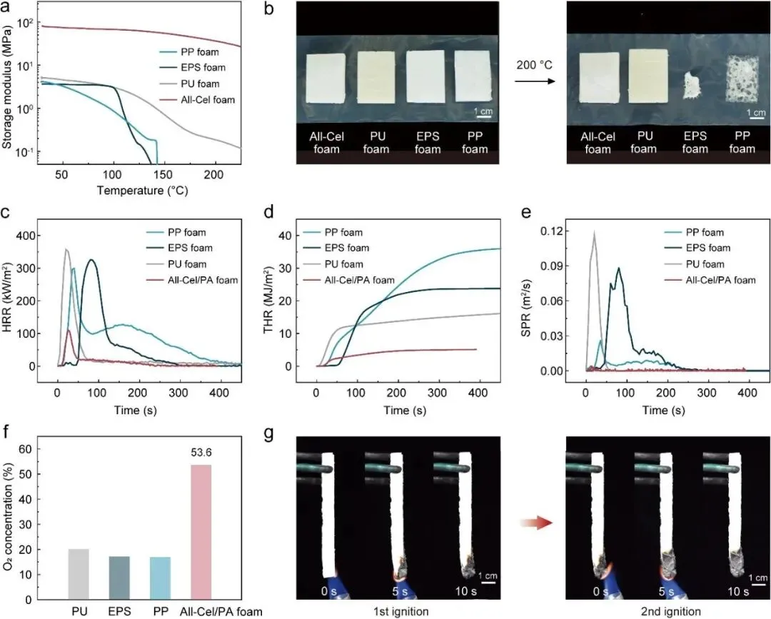 图4 | 全纤维素泡沫的热性能及阻燃处理。a 全纤维素泡沫与商业塑料泡沫的存储模量对比。b 图片展示了全纤维素泡沫与商业塑料泡沫在常温(25°C)和高温(200°C)下的外观,直观地展示了其卓越的热稳定性。c-e 全纤维素/聚丙烯泡沫与商业聚丙烯、聚乙烯泡沫和聚氨酯泡沫的锥形量热仪测试:(c)热释放速率(HRR),(d)总热释放量(THR),(e)烟产生速率(SPR)。f 全纤维素/聚丙烯泡沫的极限氧指数(LOI),突显了其对点燃和燃烧的增强抵抗能力。g 全纤维素/聚丙烯泡沫的垂直燃烧测试的数字图片展示了其抵抗和扑灭火灾的能力,证实了其在易燃环境中的实际应用价值。