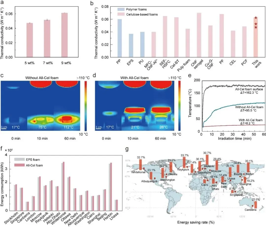 图5 | 全纤维素泡沫的隔热性能及建筑能耗评估。a 全纤维素泡沫中纤维素分子体系浓度不同情况下的热导率变化。数据以平均值±标准差的形式呈现,共进行了3次重复实验。b 全纤维素泡沫、石油基塑料泡沫以及其他纤维素基泡沫之间热导率的比较。c、d 红外热图像展示了在红外加热60分钟后,装有全纤维素泡沫和未装全聚乙烯泡沫的铁盒的温度情况。e 红外照射60分钟后铁盒的温度变化情况。f 各城市中建筑模型的年度能耗情况:使用EPS泡沫或全纤维素泡沫作为中间墙体隔热层。g 在不同全球城市中通过采用全纤维素泡沫实现的年度能耗节约量的计算结果。