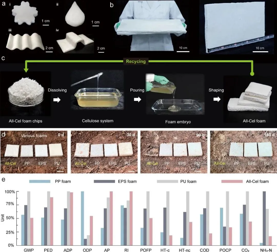 图6 | 全纤维素泡沫的特性:可塑性、可回收性、生物降解性以及对环境的影响。a 展示了各种形状的全纤维素泡沫的数字图像。花形(i)和雨滴形(ii)泡沫是通过将纤维素分子溶液倒入相应的模具中,然后进行乙醇交换而制得的。对于波形(iii)和桥梁(iv)形状的泡沫,首先将预先成型的全纤维素泡沫板在水中软化,然后放入定制模具中,最后通过乙醇交换进行重塑。b 展示了加工大型全纤维素泡沫板的能力(47 cm×28 cm×3 cm),突出了其可扩展性和在诸如隔热和结构面板等实际应用中的潜力。c 展示了全纤维素泡沫的可回收过程。使用过的全纤维素泡沫可以粉碎成碎片并重新溶解以形成纤维素体系。通过将纤维素体系倒入模具中制造新的泡沫胚胎,并通过乙醇诱导自组装来制造再生全纤维素泡沫。这一过程展示了全纤维素泡沫的可持续生命周期。a 对全纤维素泡沫与传统塑料泡沫(聚丙烯、聚乙烯膨胀聚苯乙烯和聚氨酯)在自然土壤环境下的生物降解性测试,时间跨度从0天到160天,间隔时间为0至160天不等。随着降解时间的推移,全纤维素泡沫逐渐失去结构完整性并明显分解,而传统塑料泡沫在整个期间几乎保持不变。b 将全纤维素泡沫相对于常用塑料(聚丙烯、聚乙烯膨胀聚苯乙烯和聚氨酯)的环境影响进行评估,每个影响类别均以影响最大的材料进行标准化。