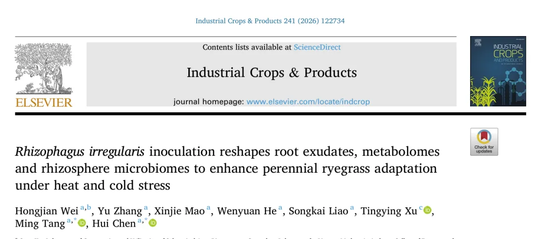 华南农业大学唐明教授、陈辉教授研究团队围绕多年生黑麦草在极端温度条件下的适应机制,在Industrial Crops and Products发表了题为 “Rhizophagus irregularis inoculation reshapes root exudates, metabolomes and rhizosphere microbiomes to enhance perennial ryegrass adaptation under heat and cold stress” 的研究论文。该研究通过整合代谢组学、根际微生物组测序及土壤理化与酶学分析,系统解析了 Rhizophagus irregularis 接种在高温和低温胁迫下调控植物—土壤—微生物互作网络的作用机制。