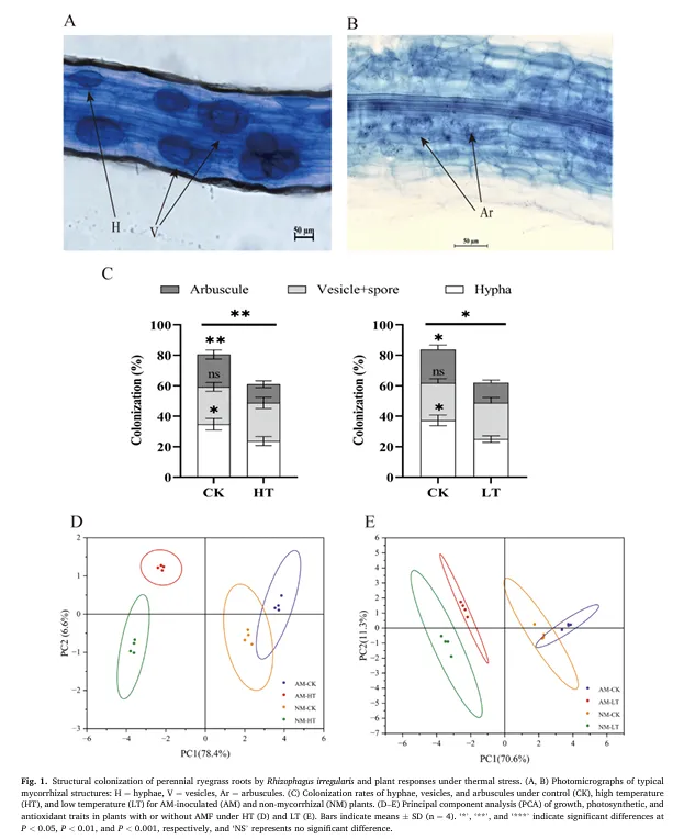 多年生黑麦草(Lolium perenne L.)是一种重要的牧草和草坪植物,同时在生物能源和生物化工原料领域具有应用潜力。然而,极端高温和低温胁迫严重限制了其生长表现和生产稳定性,尤其在气候变化背景下,这一问题日益突出。丛枝菌根真菌(arbuscular mycorrhizal fungi,AMF)能够与大多数陆生植物形成共生关系,在改善养分吸收、增强抗逆性方面具有重要作用,被认为是一种低投入、环境友好型的农业管理手段。尽管已有研究表明 AMF 可缓解温度胁迫,但其如何在器官代谢、根系分泌物调控及根际微生物群落组装之间建立系统性联动机制,仍缺乏清晰认识。