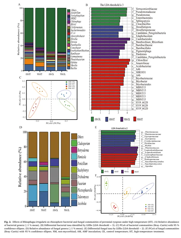(4)AM真菌重塑根际微生物群落结构:在高温条件下,根际中 Bacillus、Massilia 以及真菌 Talaromyces、Trichoderma 和 Penicillium 的相对丰度显著提高;而在低温条件下,Bacillus 和 Pseudomonas 明显富集,同时 Fusarium 的相对丰度下降。这表明 AM真菌通过调控根系分泌物,定向招募有益微生物并抑制潜在病原。