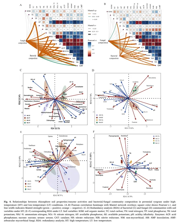 (1)AM真菌稳定多年生黑麦草生长与土壤养分状态:在高温和低温胁迫条件下,AM真菌接种显著缓解了多年生黑麦草的生长抑制,维持了光合作用效率和抗氧化状态。同时,AM真菌显著提高了土壤中有效磷、铵态氮含量,并增强了碳氮循环相关酶活性,为植物耐逆性提供了养分与代谢基础。