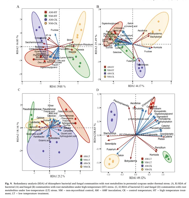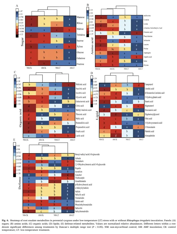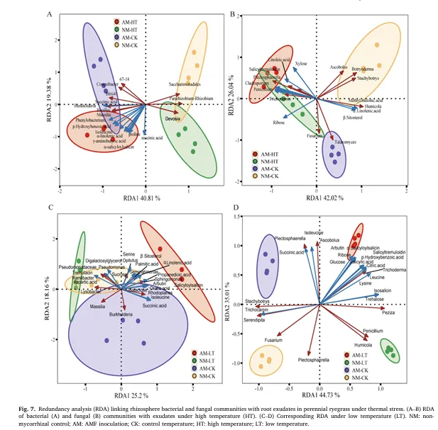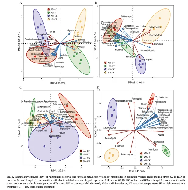 综上所述,该研究系统阐明了 AM真菌通过协调植物器官代谢、根系分泌物组成和根际微生物组装,增强多年生黑麦草耐高温和耐低温能力的机制。研究强调了 “不同胁迫条件下,耐逆性由不同器官代谢主导” 的调控模式,为深入理解植物—AM真菌—根际微生物协同适应极端环境提供了新视角。研究成果为草坪和牧草系统中应用 AM真菌实现低投入、环境友好型逆境管理提供了重要理论依据。