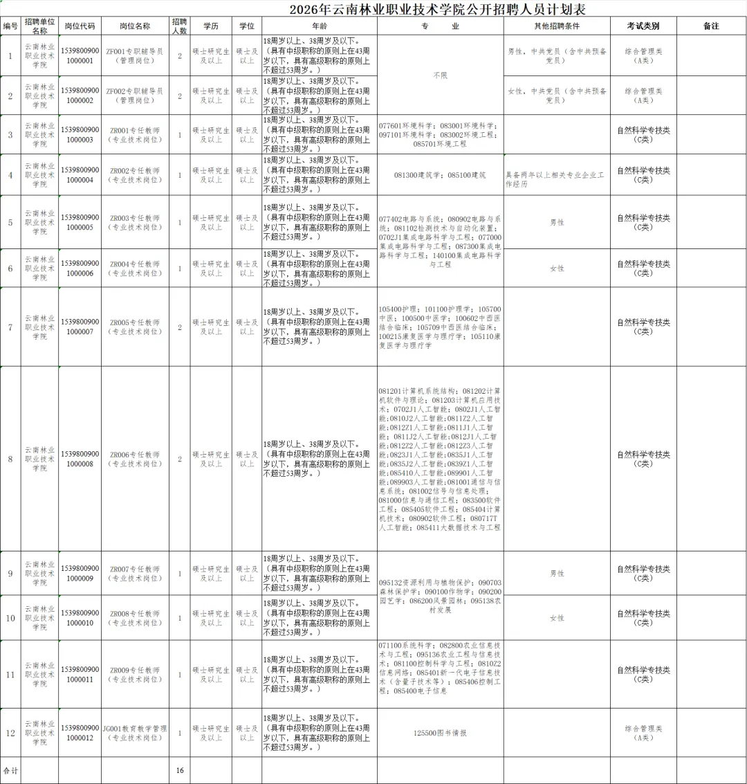 2026年上半年云南林业职业技术学院公开招聘人员16名,具体招聘岗位及招聘条件,详见《2026年云南林业职业技术学院公开招聘人员计划表》(附件1)。